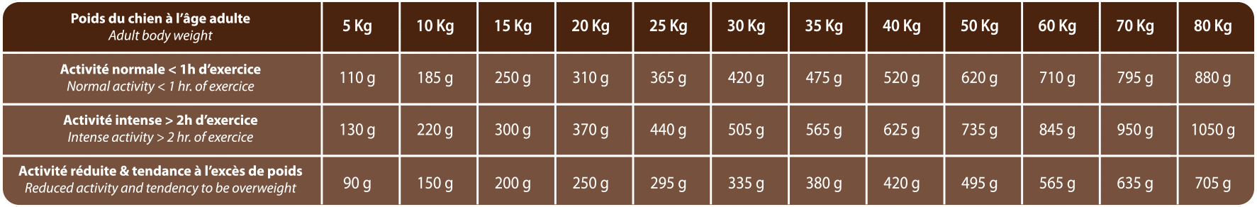 Forme et équilibre : Un rapport protido-calorique optimisé et un tableau de rationnement adapté, pour participer au maintien du poids de forme chez le chien senior, tout en conservant une bonne activité musculaire. |